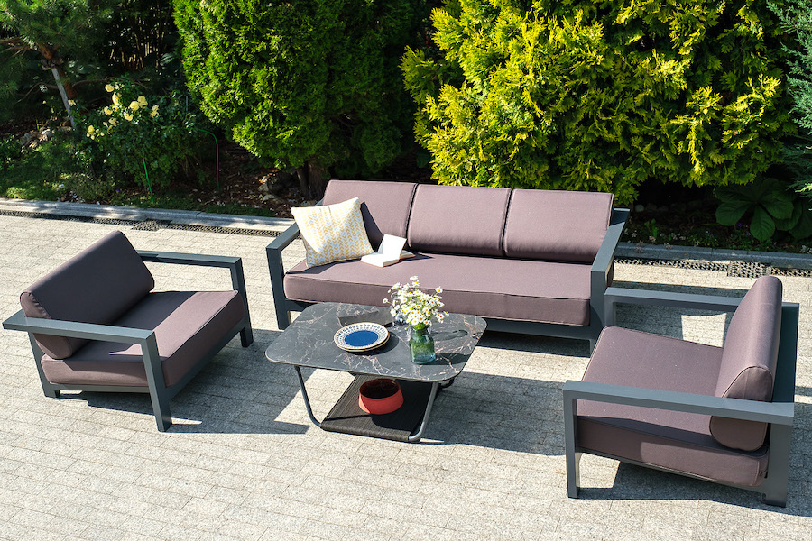 Стильный трехместный диван «Гранада» для обустройства зоны отдыха на балконе, в кафе или летней веранде. Каркас изготовлен из высокопрочного алюминия темно-серого (RAL7024) цвета.