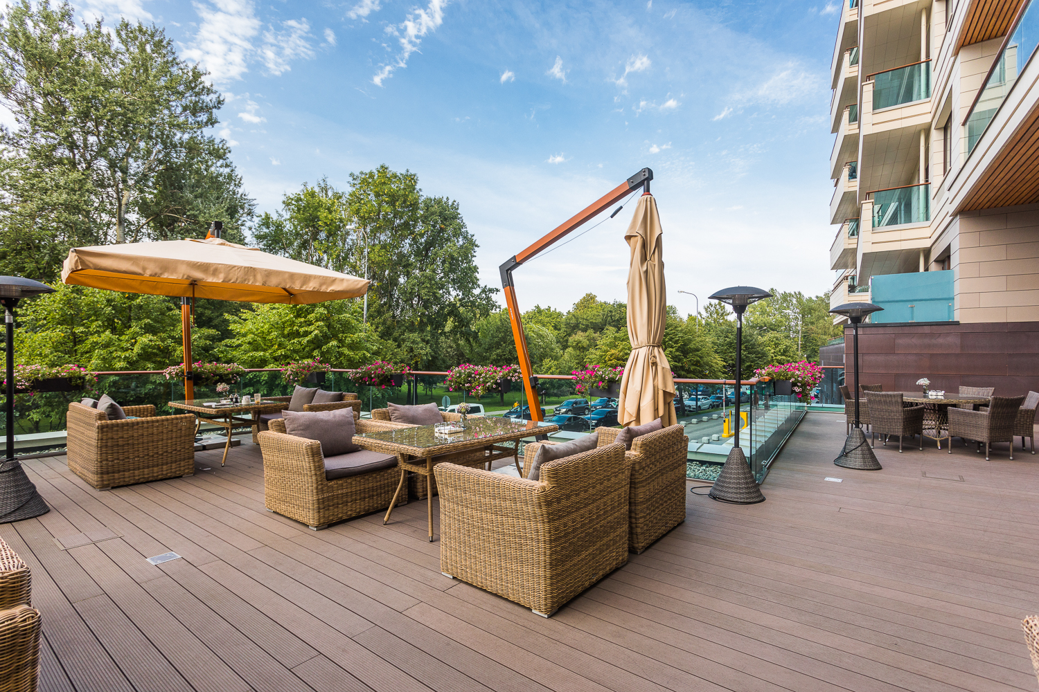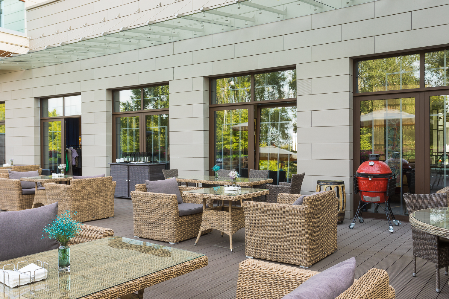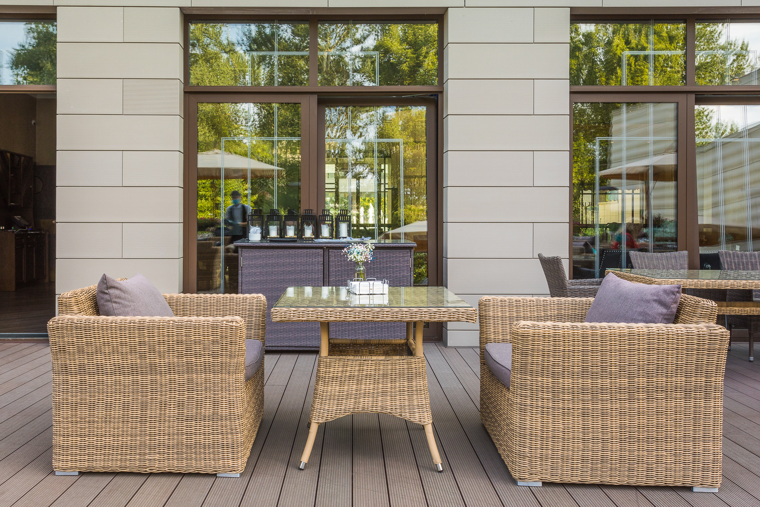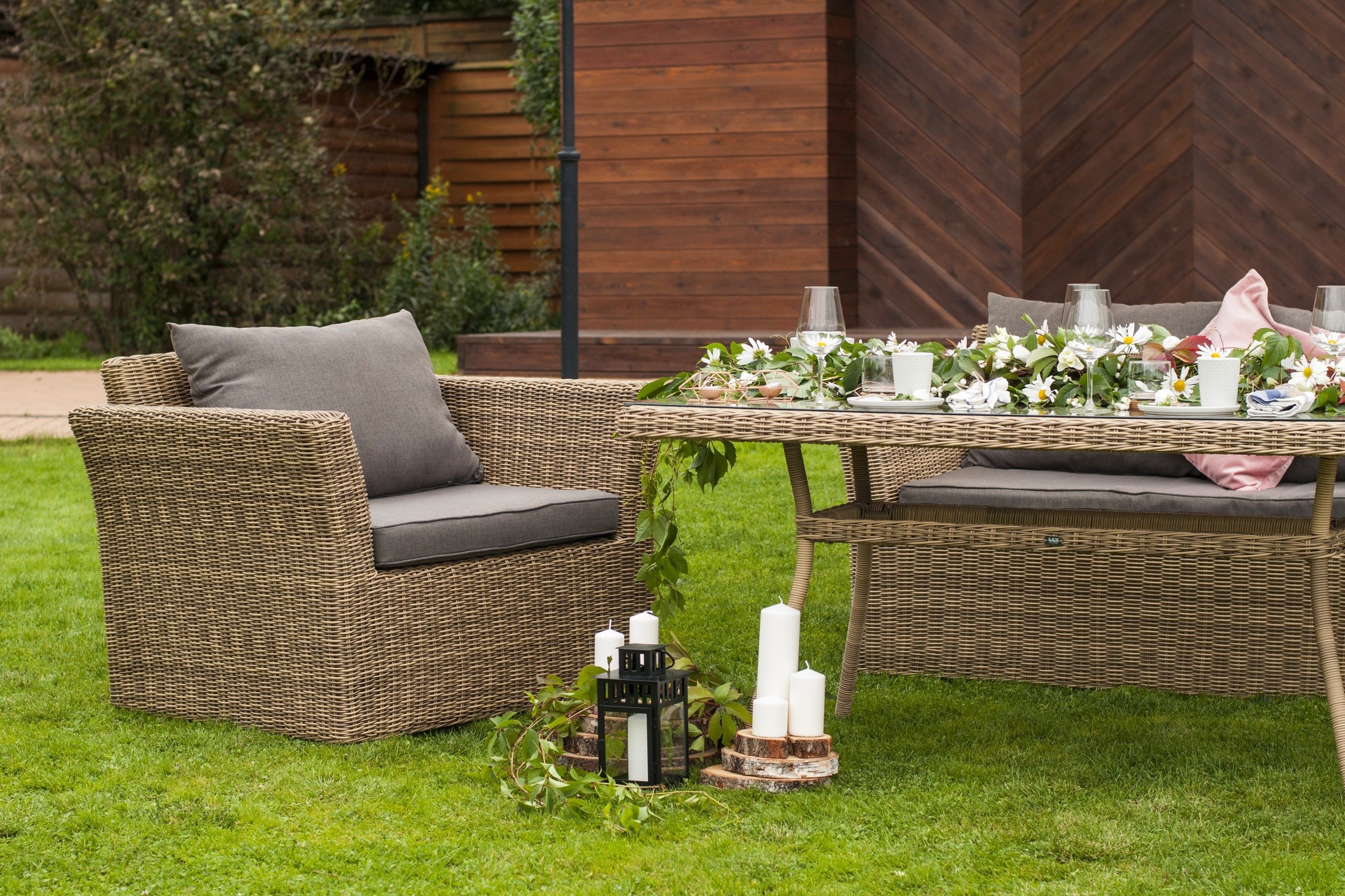 Ее отличает алюминиевый каркас высокой прочности. В качестве декоративной составляющей выступает ручное плетение на основе круглого искусственного ротанга. Оно выполнено в соломенном оттенке.