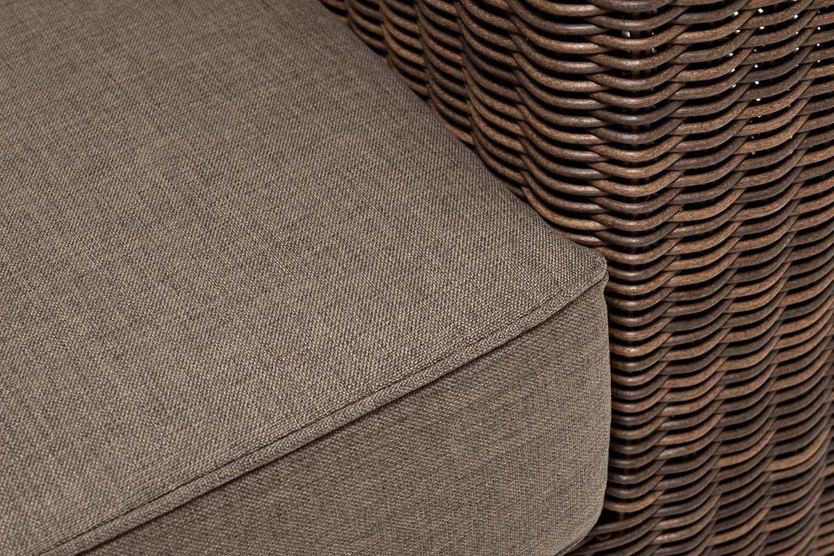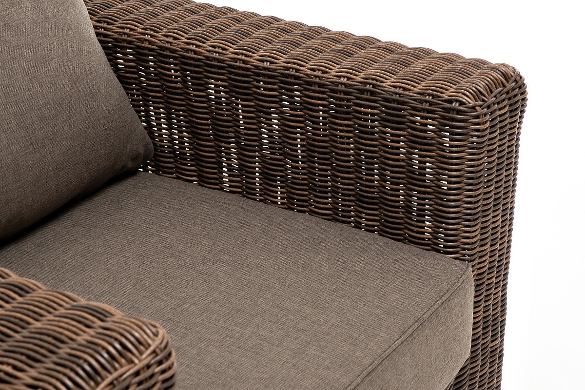 Кресло оснащено каркасом из прочного алюминия, ручное круглое плетение является основным декоративным элементом мебели. Оно выполнено из искусственного ротанга в коричневом цвете.
