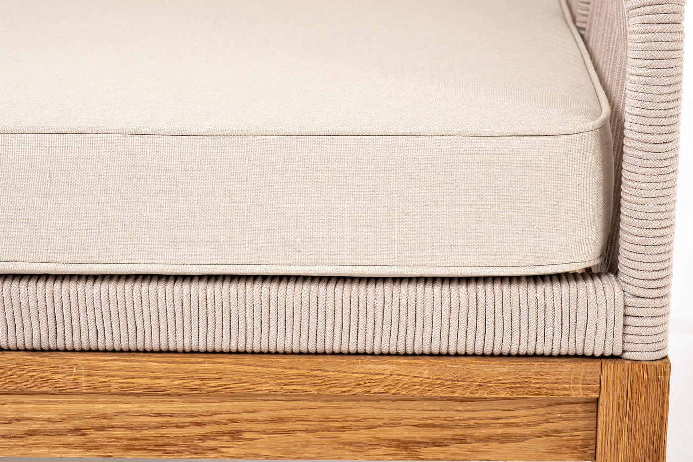 "Канны" левый модуль плетеный из роупа, основание дуб, роуп бежевый круглый, ткань бежевая 052
