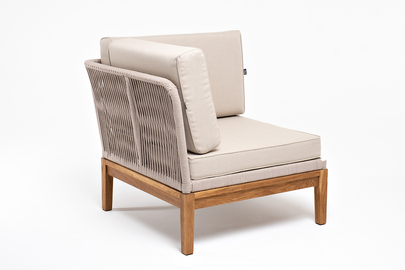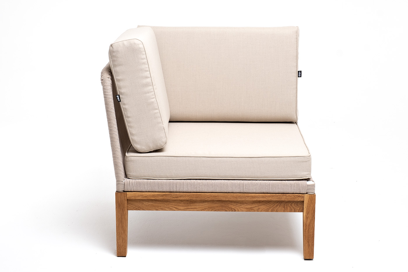 "Канны" угловой модуль плетеный из роупа, основание дуб, роуп бежевый круглый, ткань бежевая 052