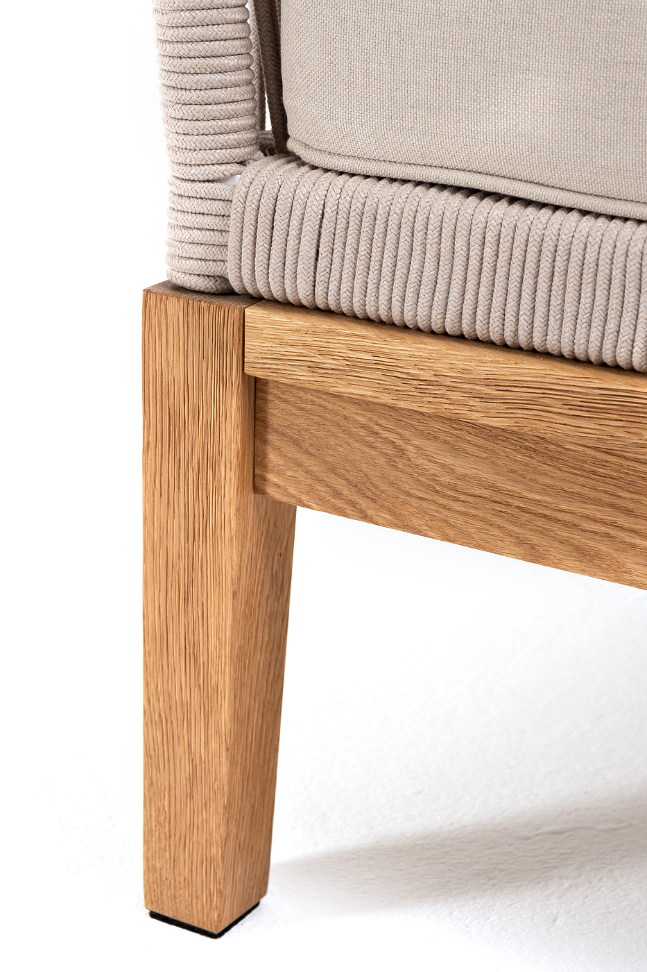 Боковины каркаса вручную оплетены роупом - эластичными синтетическими лентами, изготовленными из высокопрочных полиэфирных волокон. Цвет оплетки - бежевый. Основание дуб.