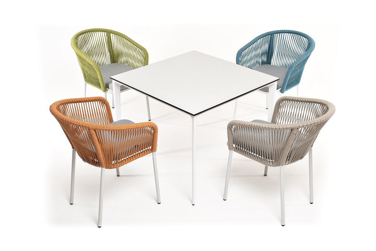 Каркас стульев выполнен из алюминия. Оплетка выполнена вручную современным материалом - роупом. Цвет оплетки - бирюзовый, салатовый меланж, оранжевый меланж и серый меланж. В комплект входят подушки со съёмными водоотталкивающими чехлами светло-серого цвета.
